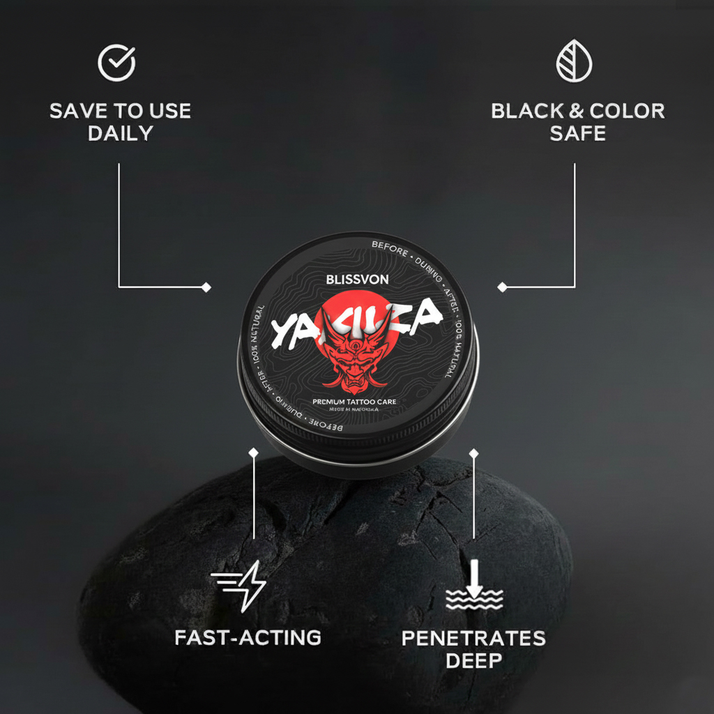 Your tattoos are an investment in your story—protect them with the strength and purity they deserve. Blissvon Yakuza Premium Tattoo Care is the ultimate all-in-one skin companion, meticulously crafted to keep your ink bold, bright, and defined for a lifetime.